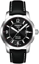 Very readable and large dial a great watch if you are a Tissot fan with discrete red highlights on the seconds and a T on the second hand both pointing to the Swiss history and the brand. A very solid watch with a screw down crown 200meter waterproof may appear a bit strange with a leather band but I sail and have had humidity problems with other "waterproof" watches without immersion. This one is not going to have those problems! Lots of PRC200 reviews gripe abut the difficulty in getting it on and off with the mixed leather and clasp band make sure you unsnap both clasps before removal then it works great. This was one key factor for me I love leather bands but they wear too quickly buckling and unbuckling this clever mecanism saves the wear on the leather (but if you don't unsnap both clasps it would be a nightmare to get on and off.More detail ...